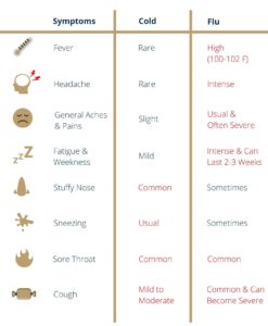 The flu and the common cold are both respiratory illnesses but are caused by different viruses. These illnesses have very similar symptoms and it can be difficult to tell them apart. The difference is in how intense the symptoms feel and how common they are. In general, symptoms of the flu appear quickly, while symptoms of a cold happen slowly. While cold symptoms can make you feel bad for a few days, flu symptoms can make you feel quite ill for a few days to weeks. The flu can also result in serious health problems such as pneumonia and hospitalizations.