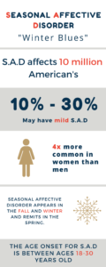 Seasonal Affective Disorder (SAD) is a type of depression that is related to changes in seasons. SAD begins and ends at about the same times every year. If you are like most people with SAD, your symptoms start in the fall and continue into the winter months, sapping your energy and making you feel moody. The symptoms can be distressing and overwhelming and can interfere with daily functioning. However, it can be treated. About 5% of adults in the U.S. experience SAD and it typically lasts about 40% of the year.