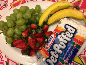 3. Using a toothpick, assemble the Grinch with the grape for the body, then banana slice, then strawberry and the mini marshmallow on top.